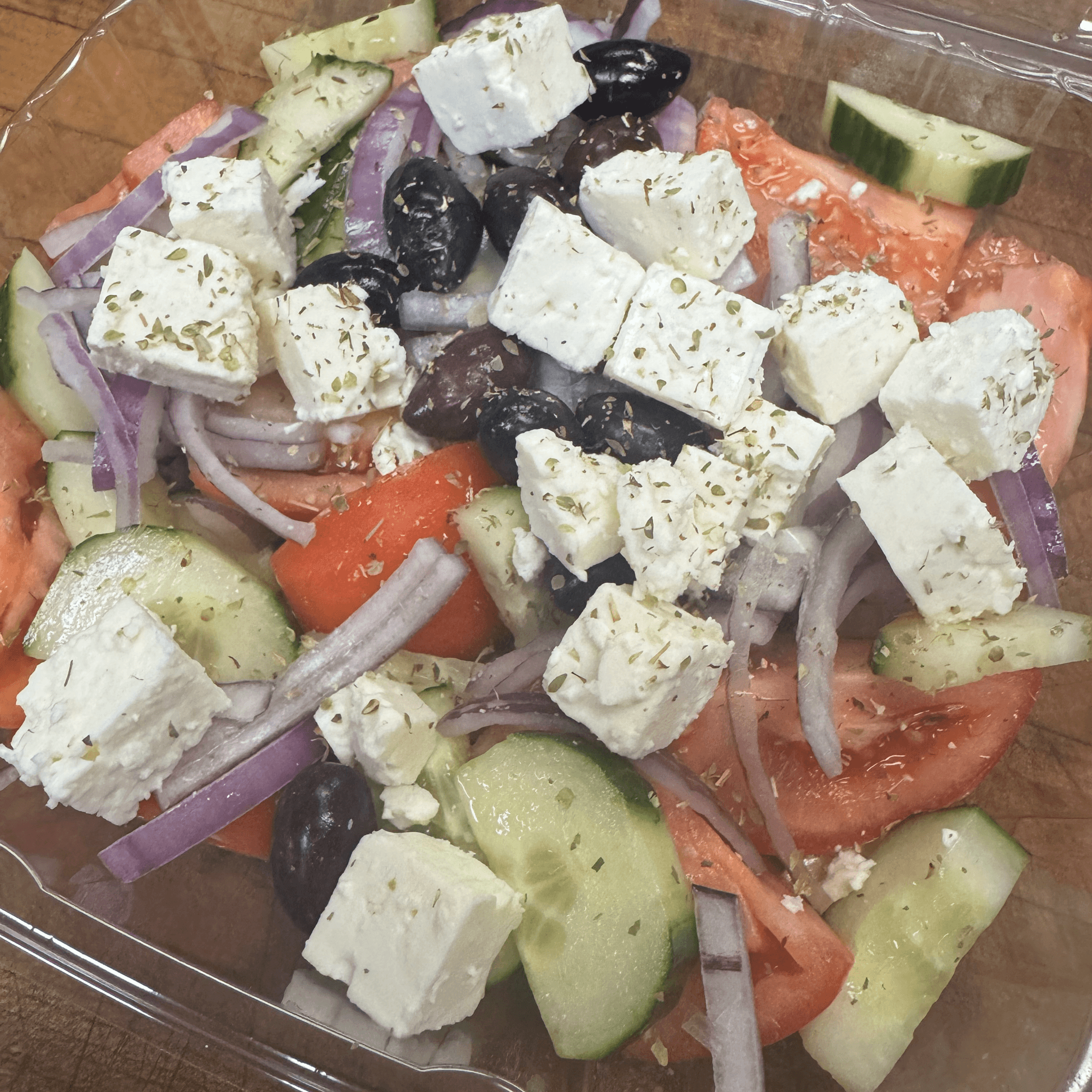 Authentic Greek salad with tomato, cucumber, red onion, olives, feta, and oregano finish. Served with fresh pita