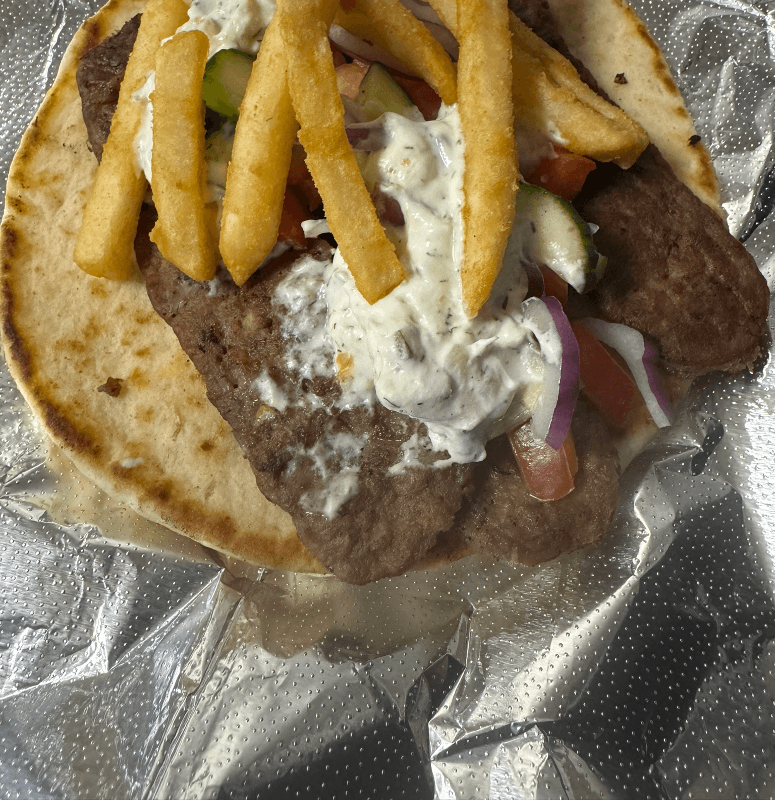 Gyro meat, lettuce, tomato, peppers, onions, celery, cucumbers, & topped with fries