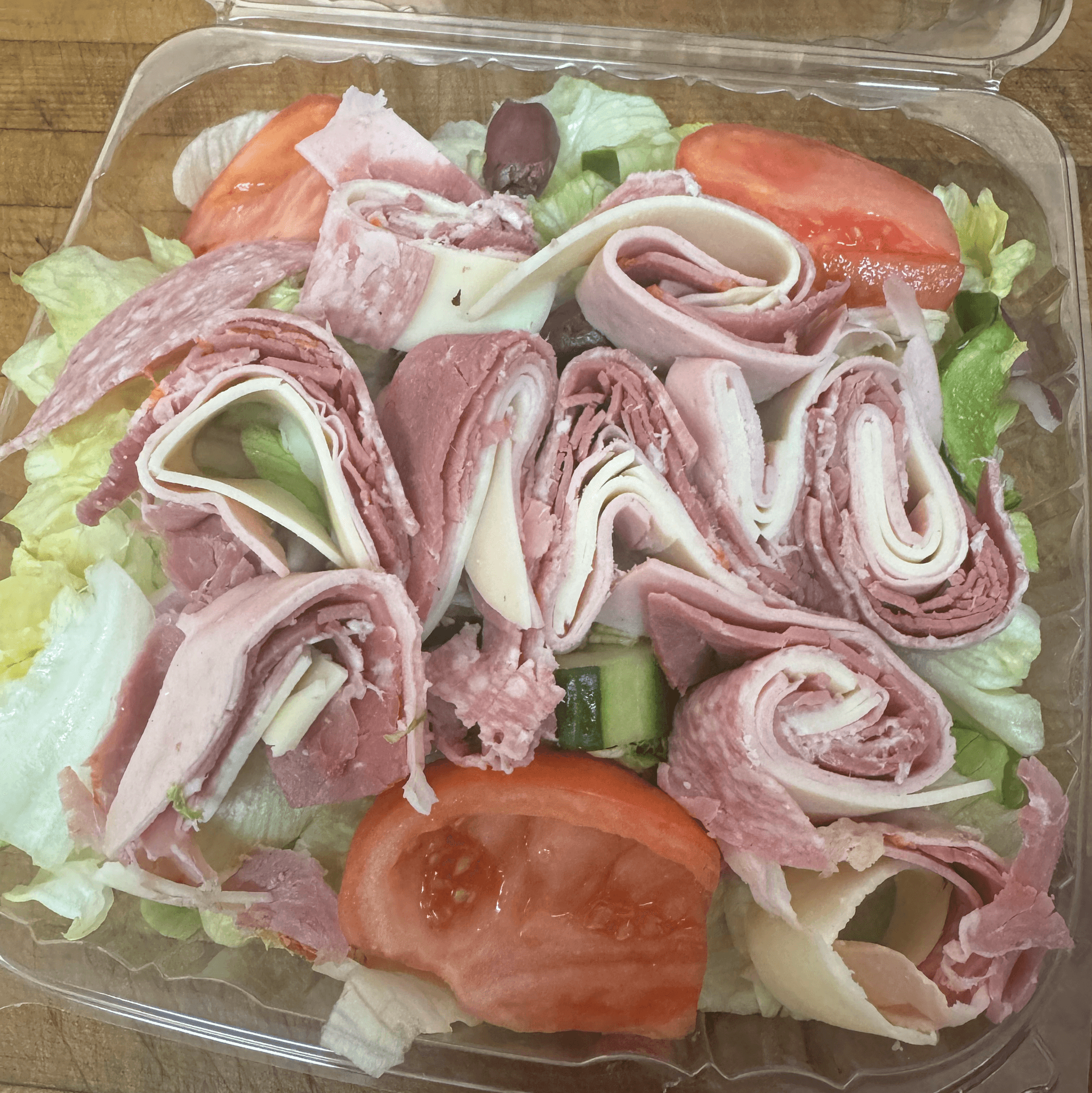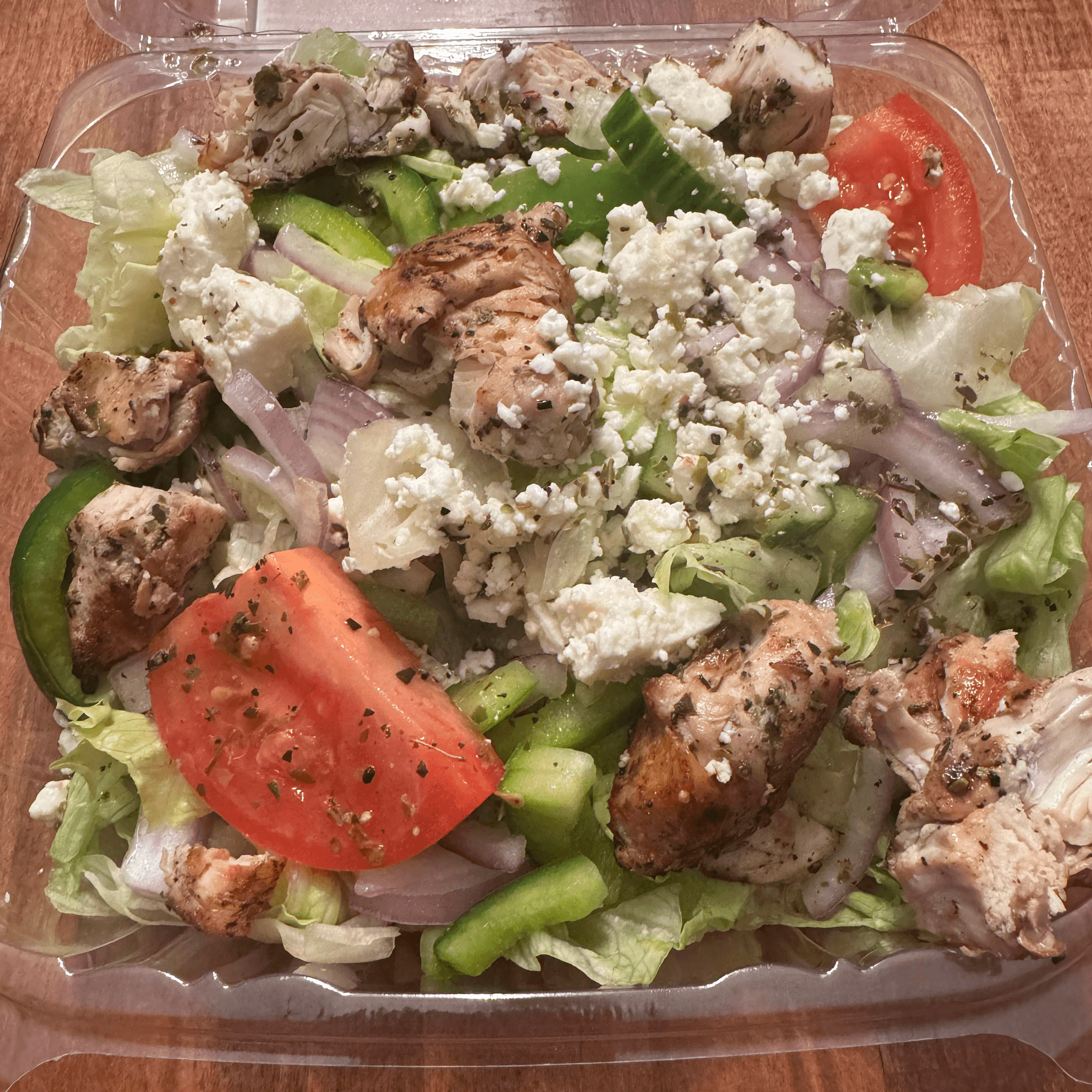 Lettuce, Tomato, Peppers, Onion, Celery, Cucumbers, Feta, and Greek Dressing