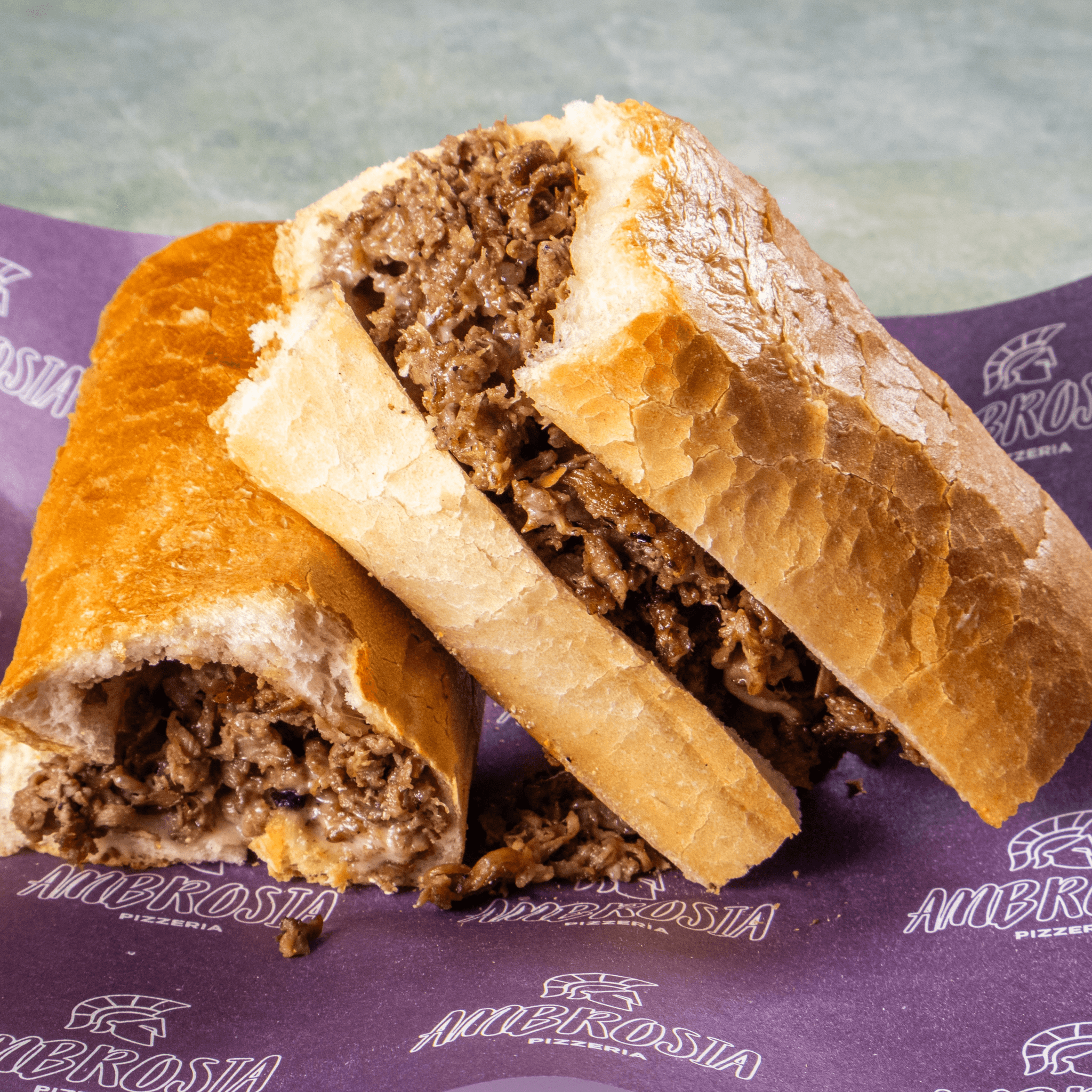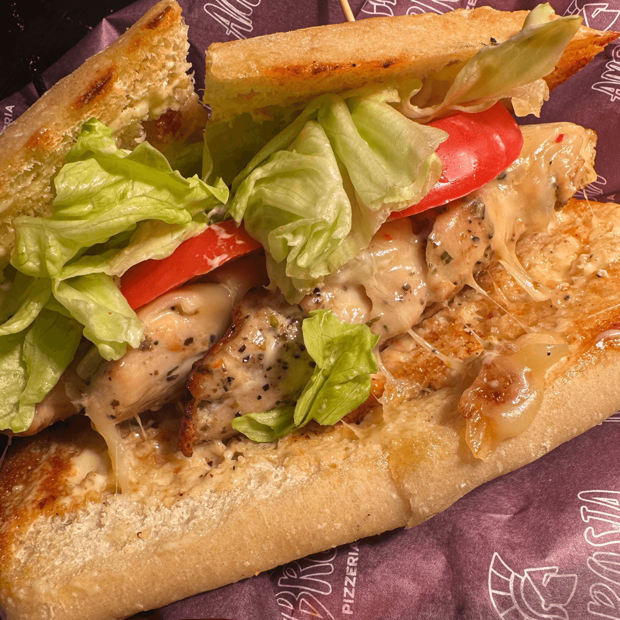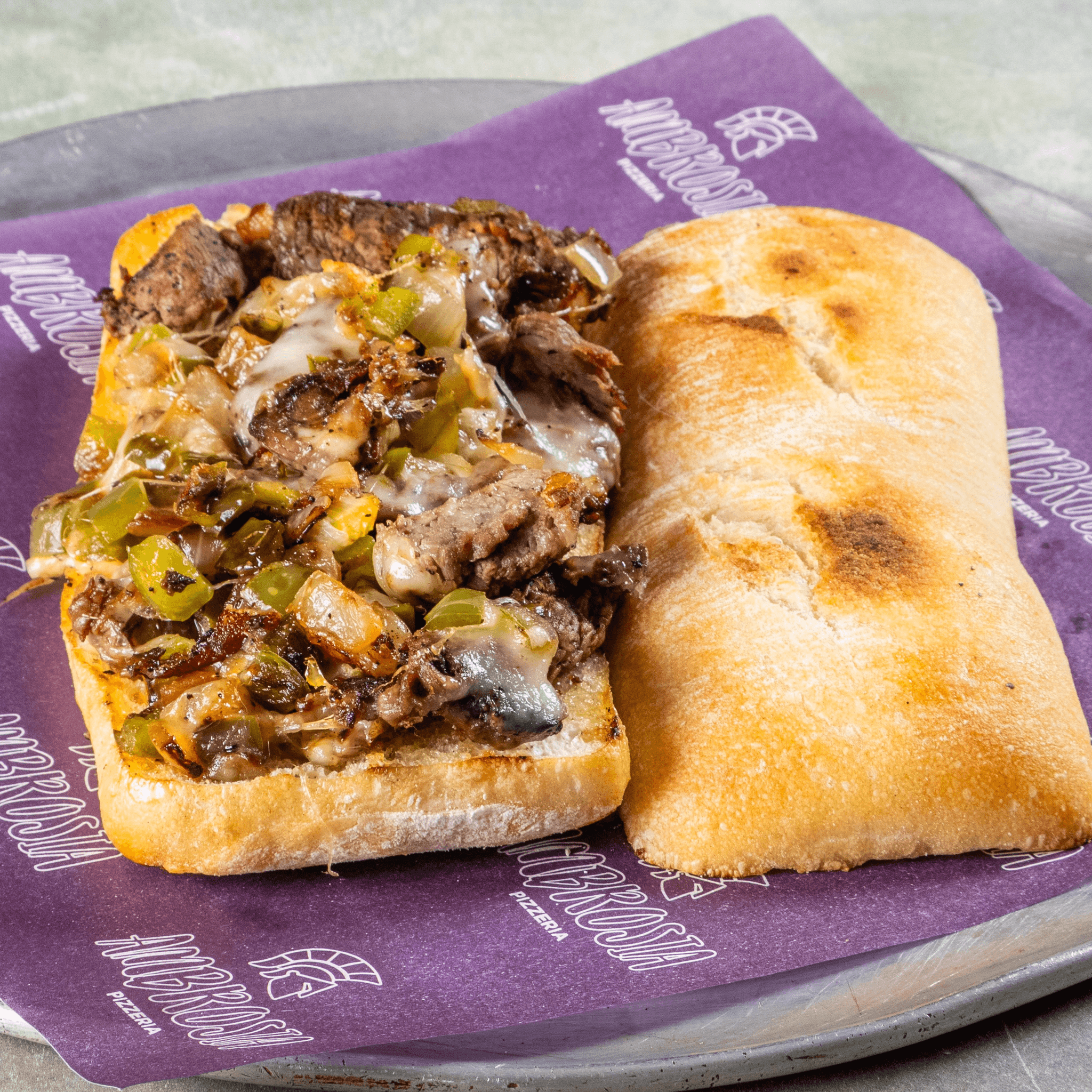 Tender grilled steak with green peppers, mushrooms, onions, provolone, and oil on a toasted baguette