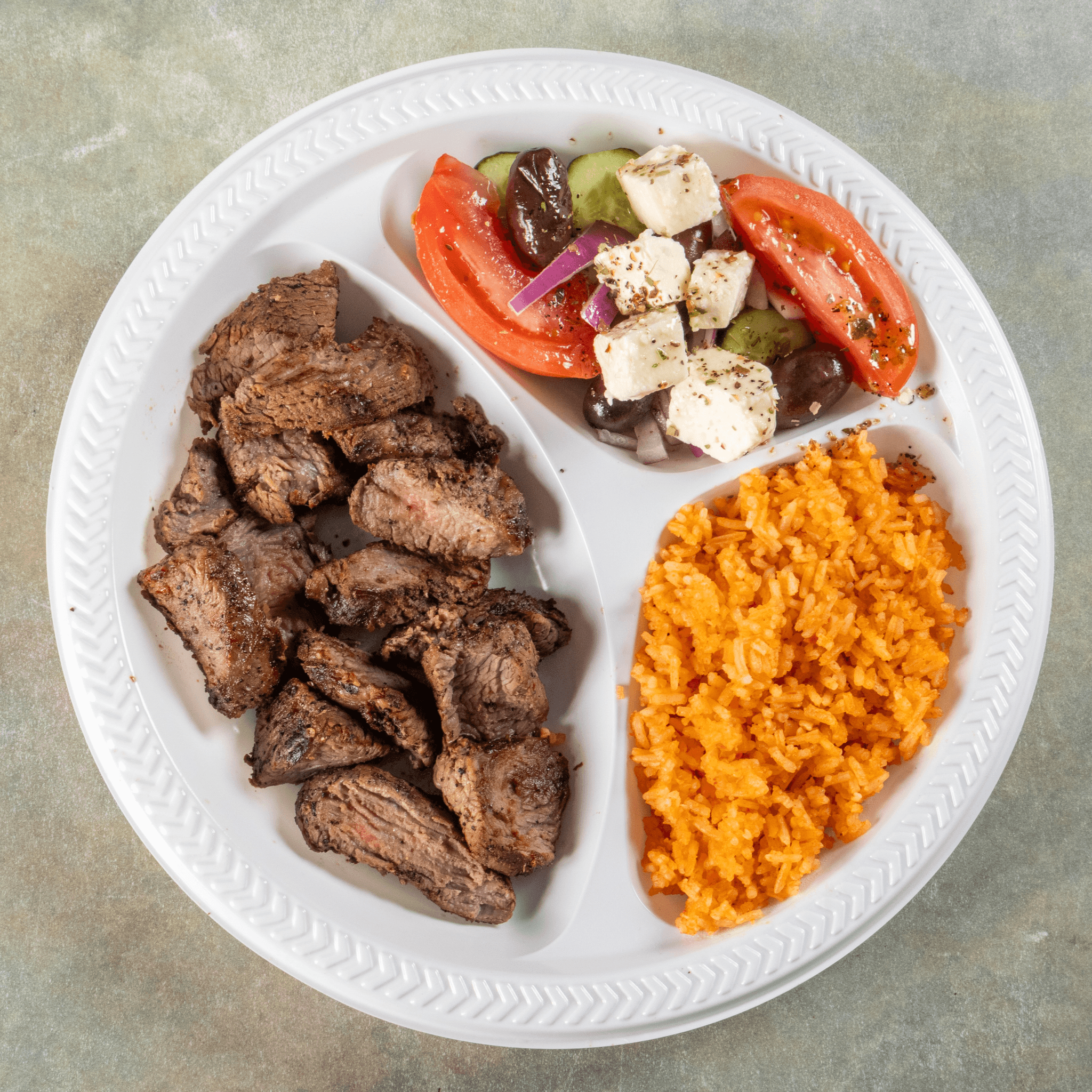 Grilled and marinated teres major steak, known for its tenderness and rich flavor, served with your choice of two sides (rice pilaf and Greek horiatiki salad pictured).