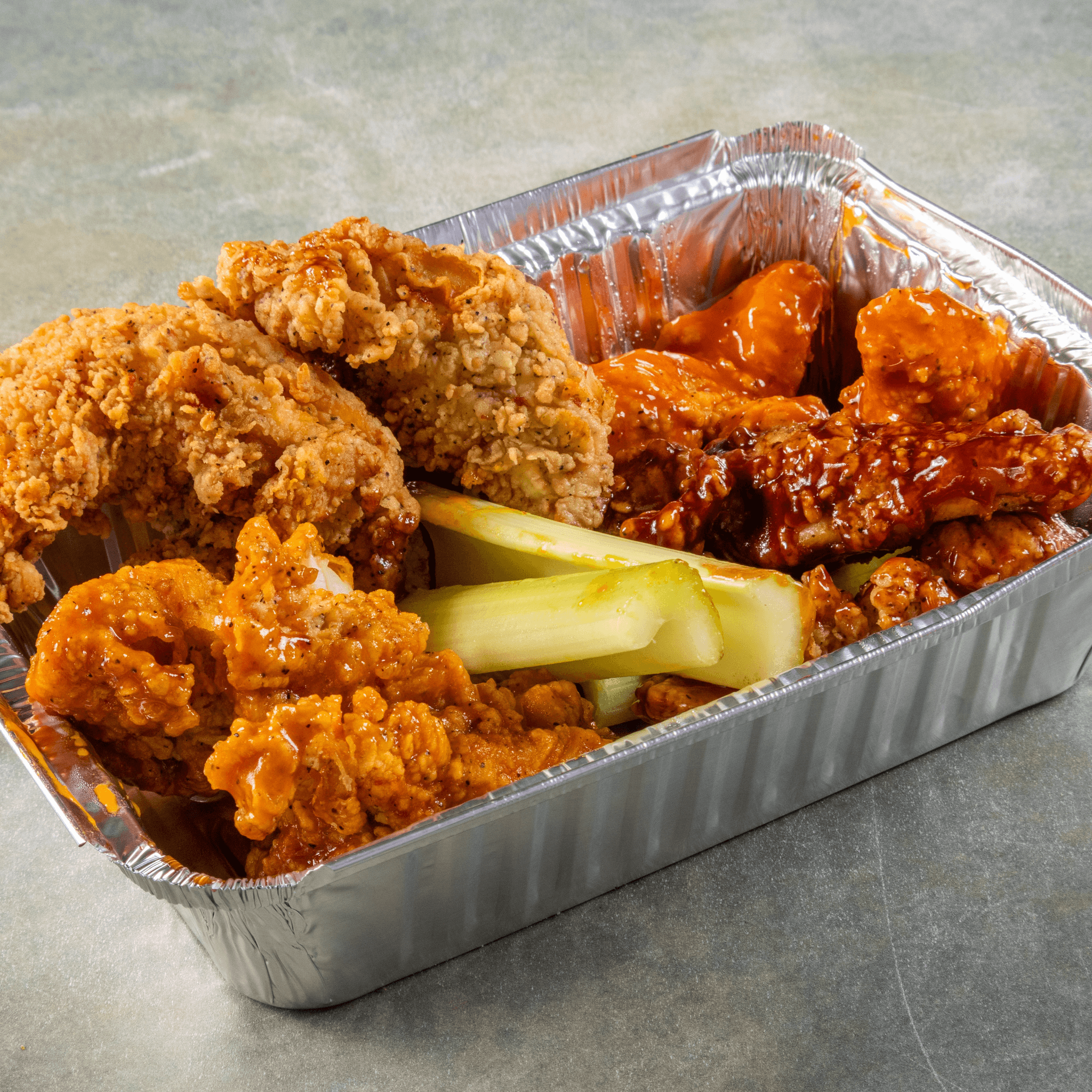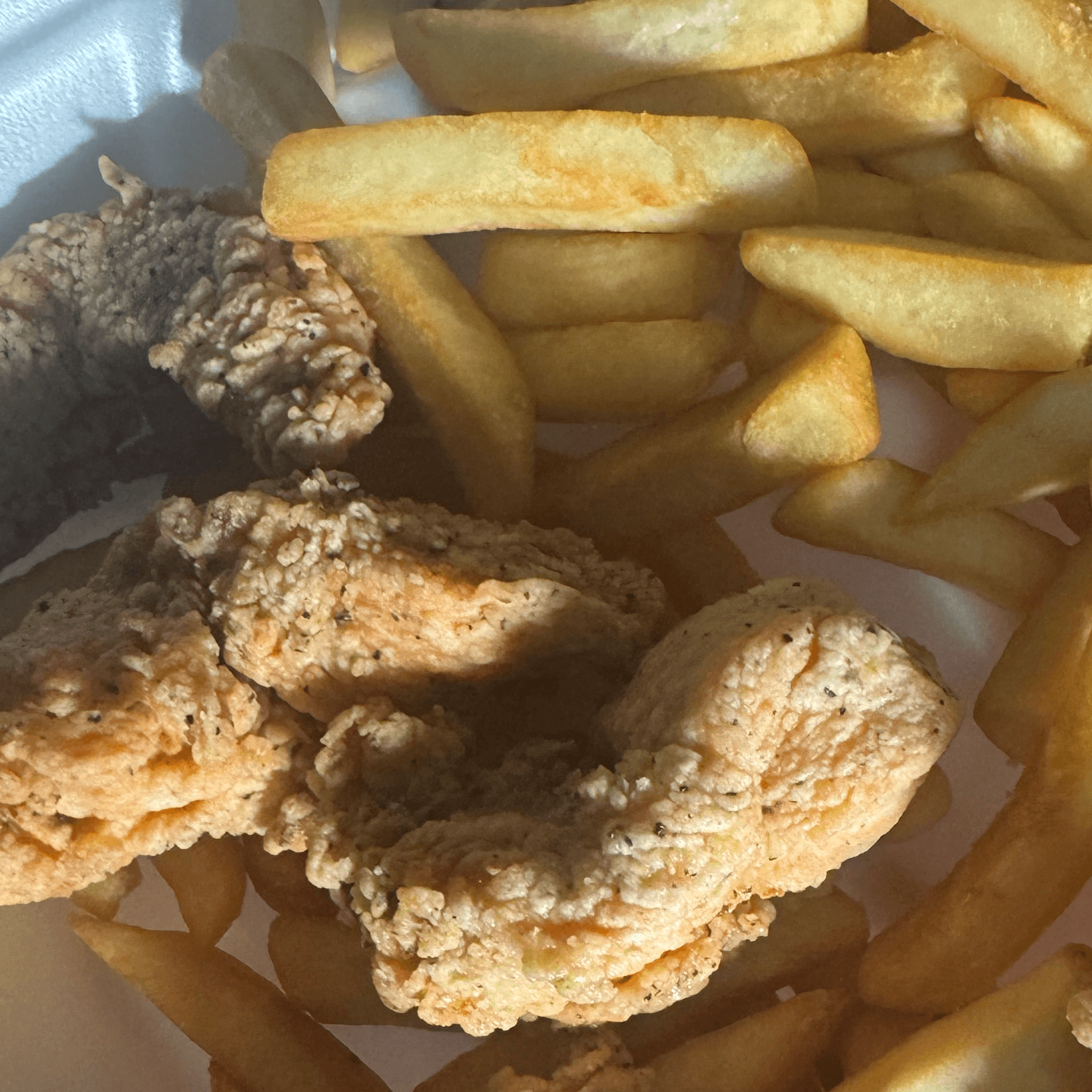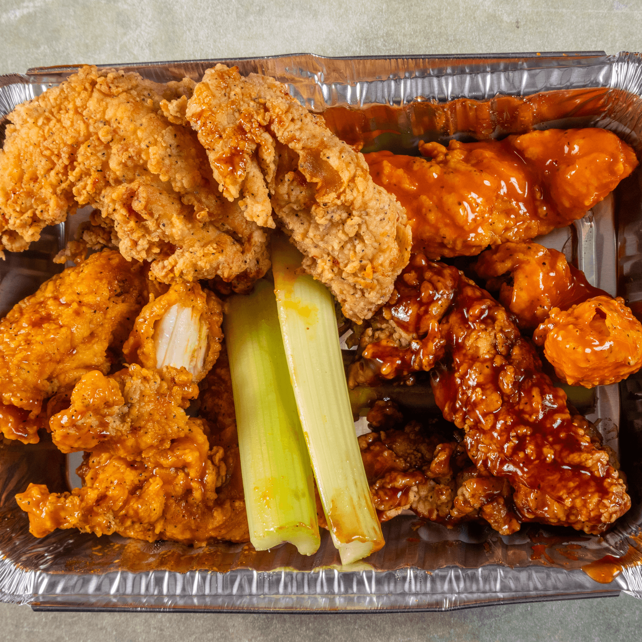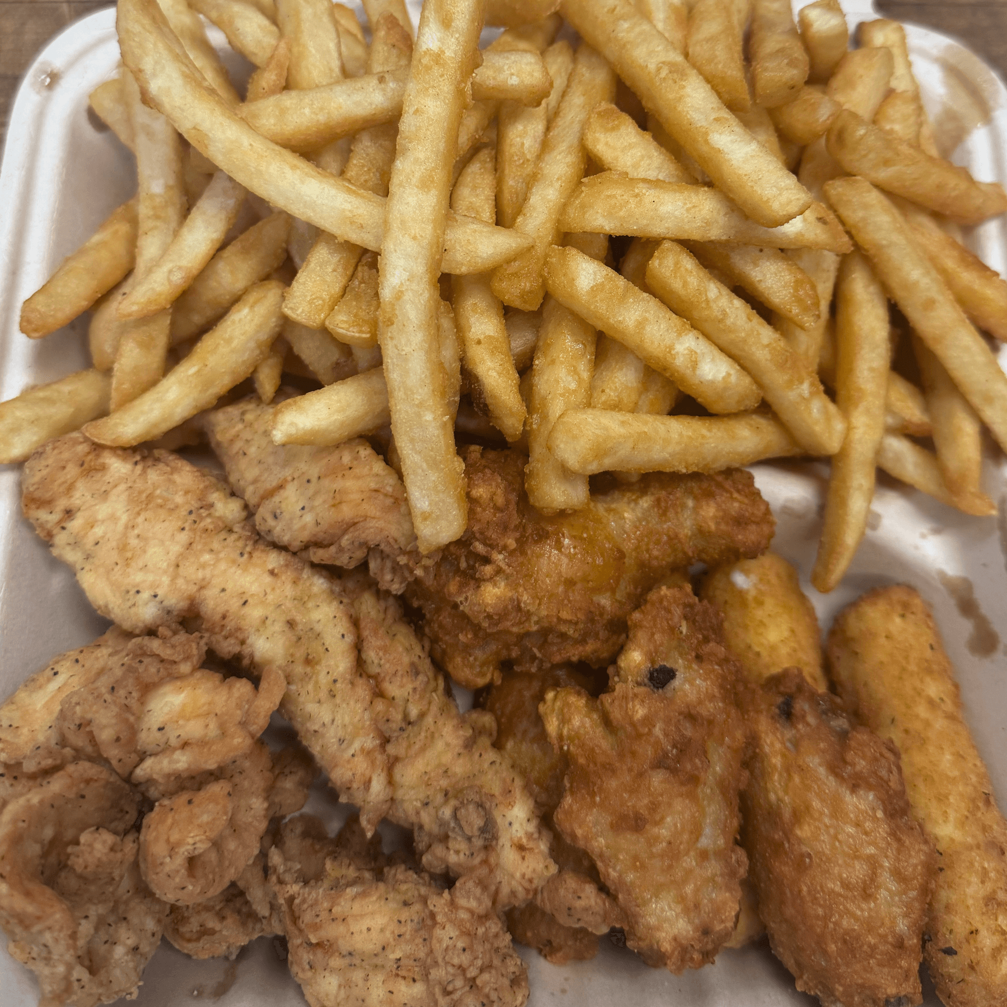 (3) wings, (3) tenders, (3) mozzarella sticks, and fries