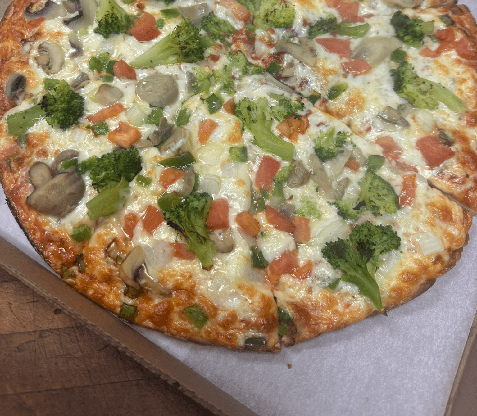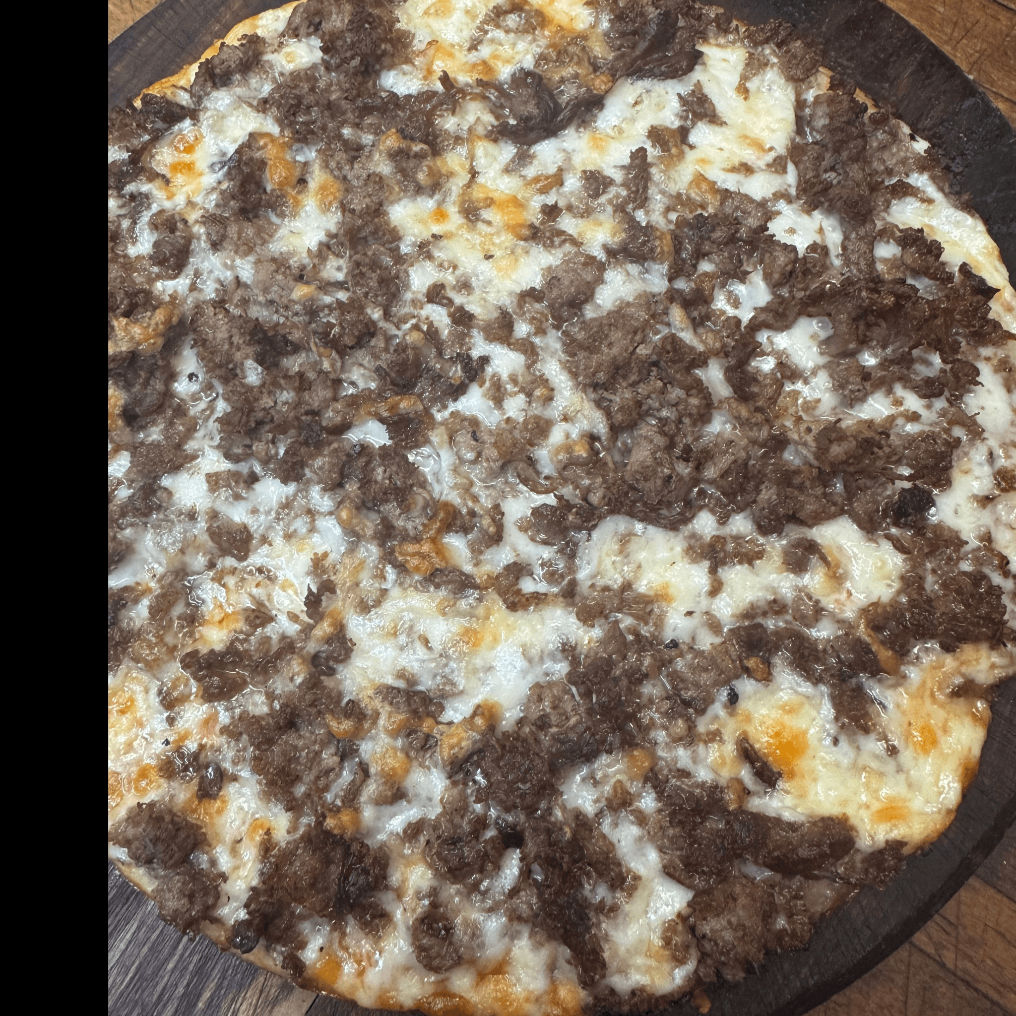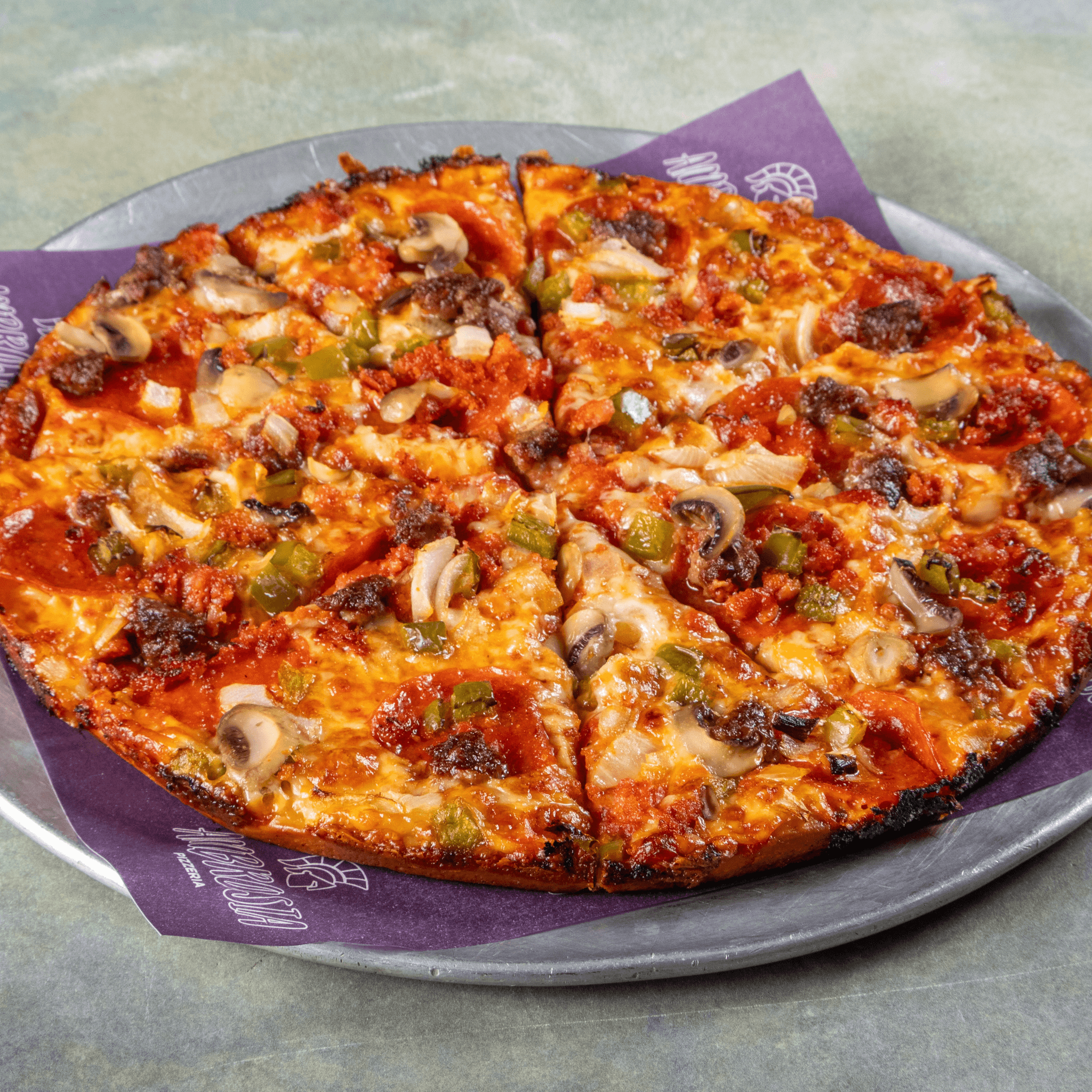 Pepperoni, hamburg, linguica, peppers, onions, mushrooms