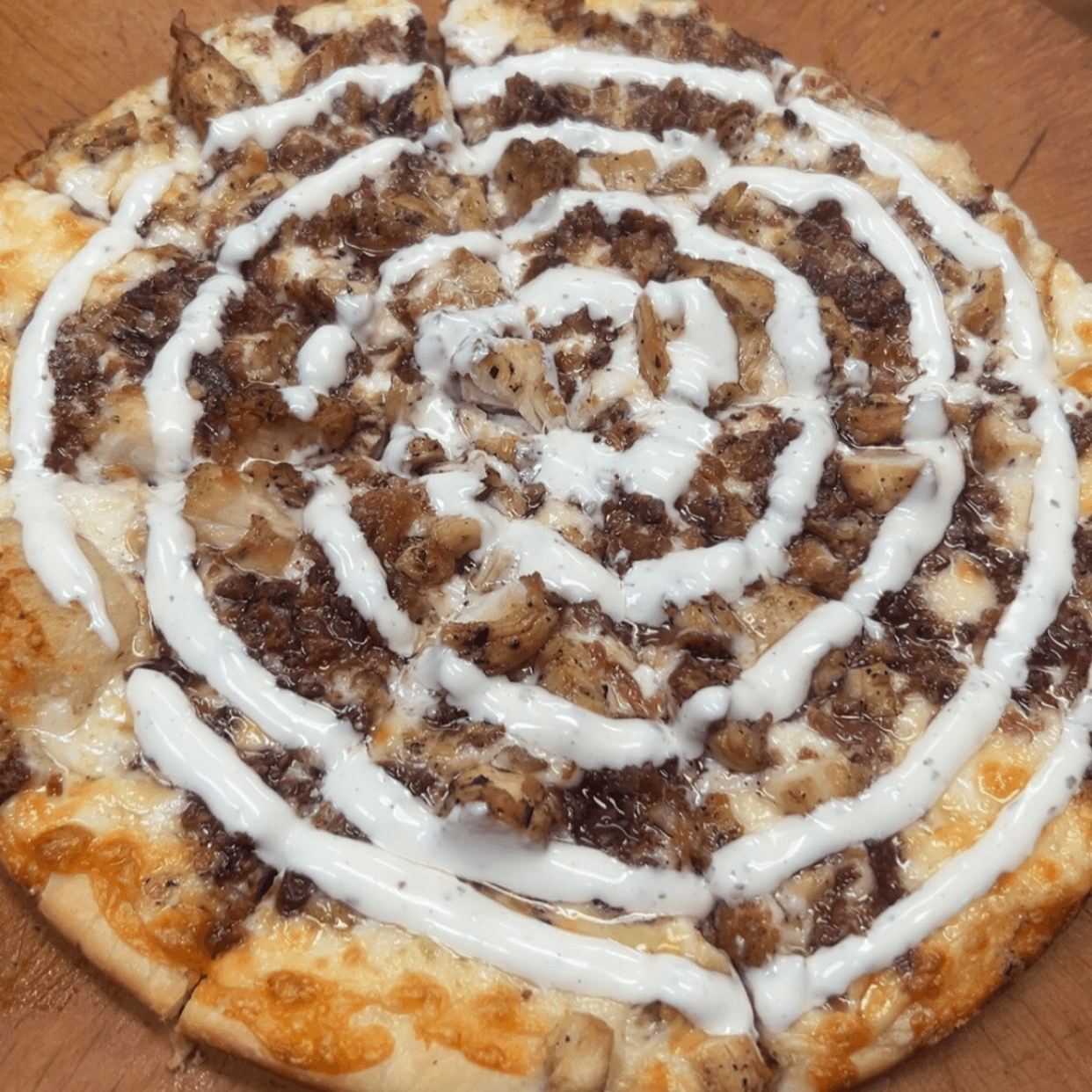 Grilled onion, mushrooms, peppers, American cheese, and BBQ sauce