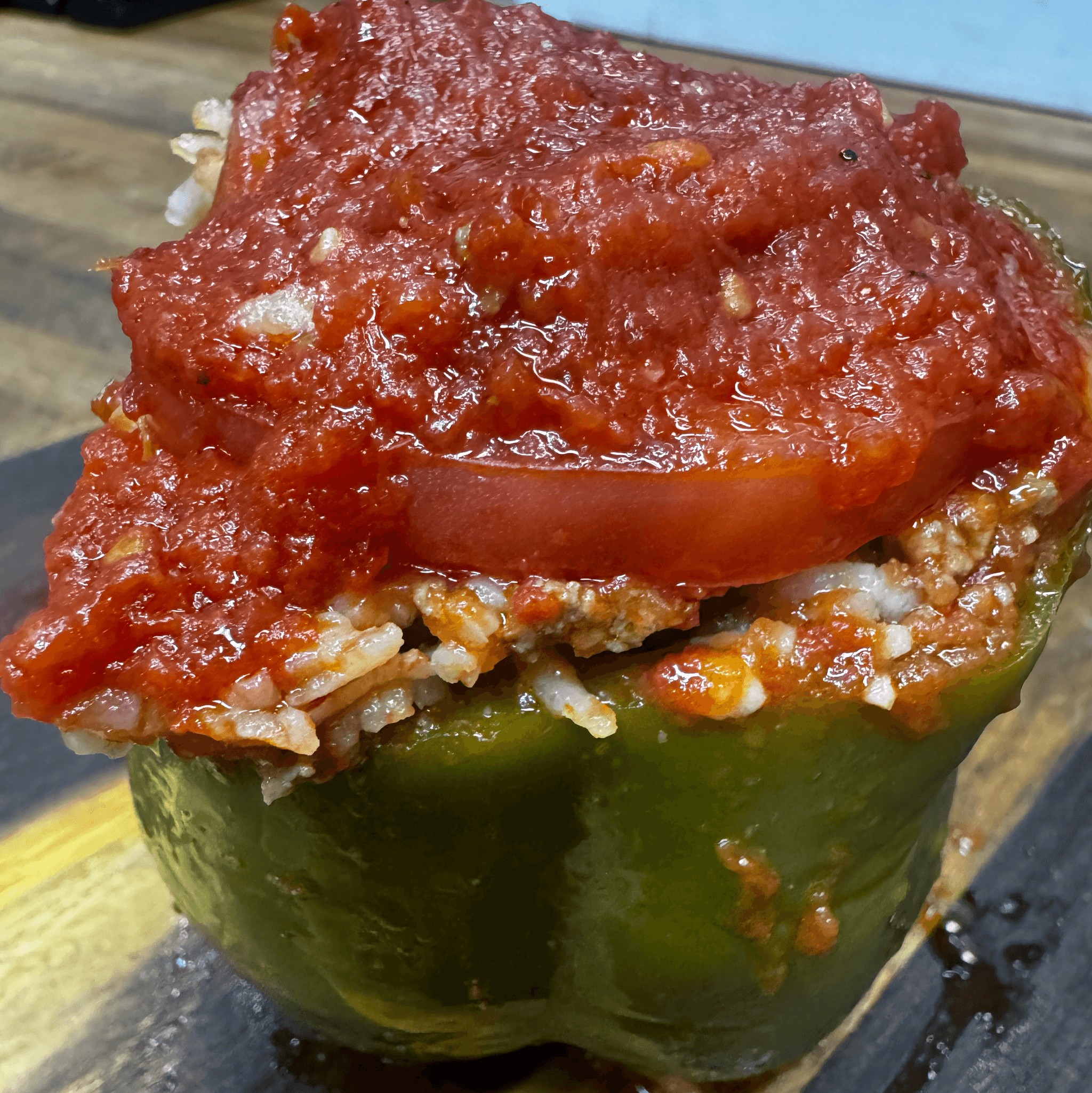 Homemade stuffed green pepper filled with seasoned beef and rice, topped with rich tomato sauce.