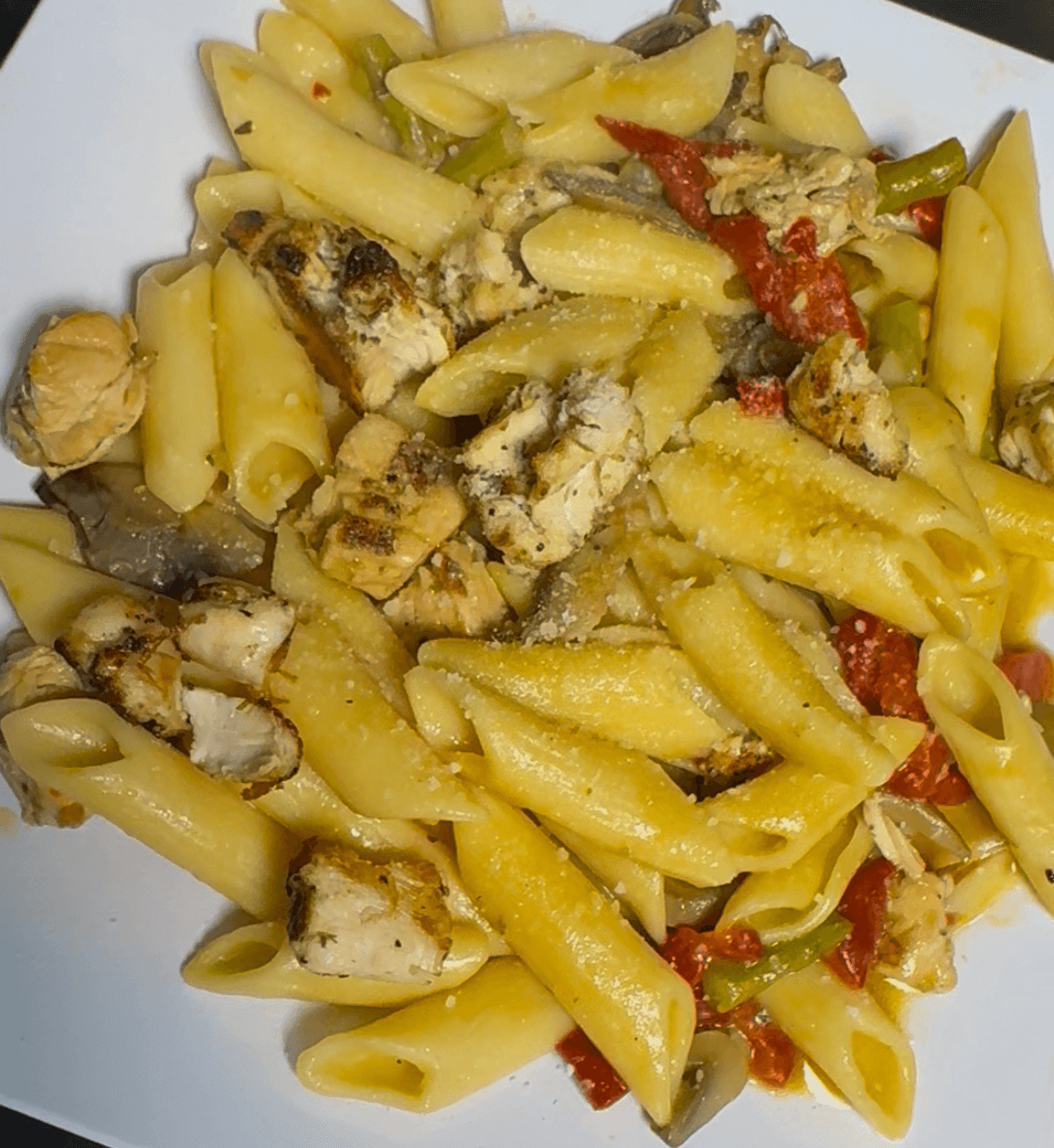 Sautéed chicken, shrimp, linguica, green peppers, and tomatoes in spicy alfredo sauce