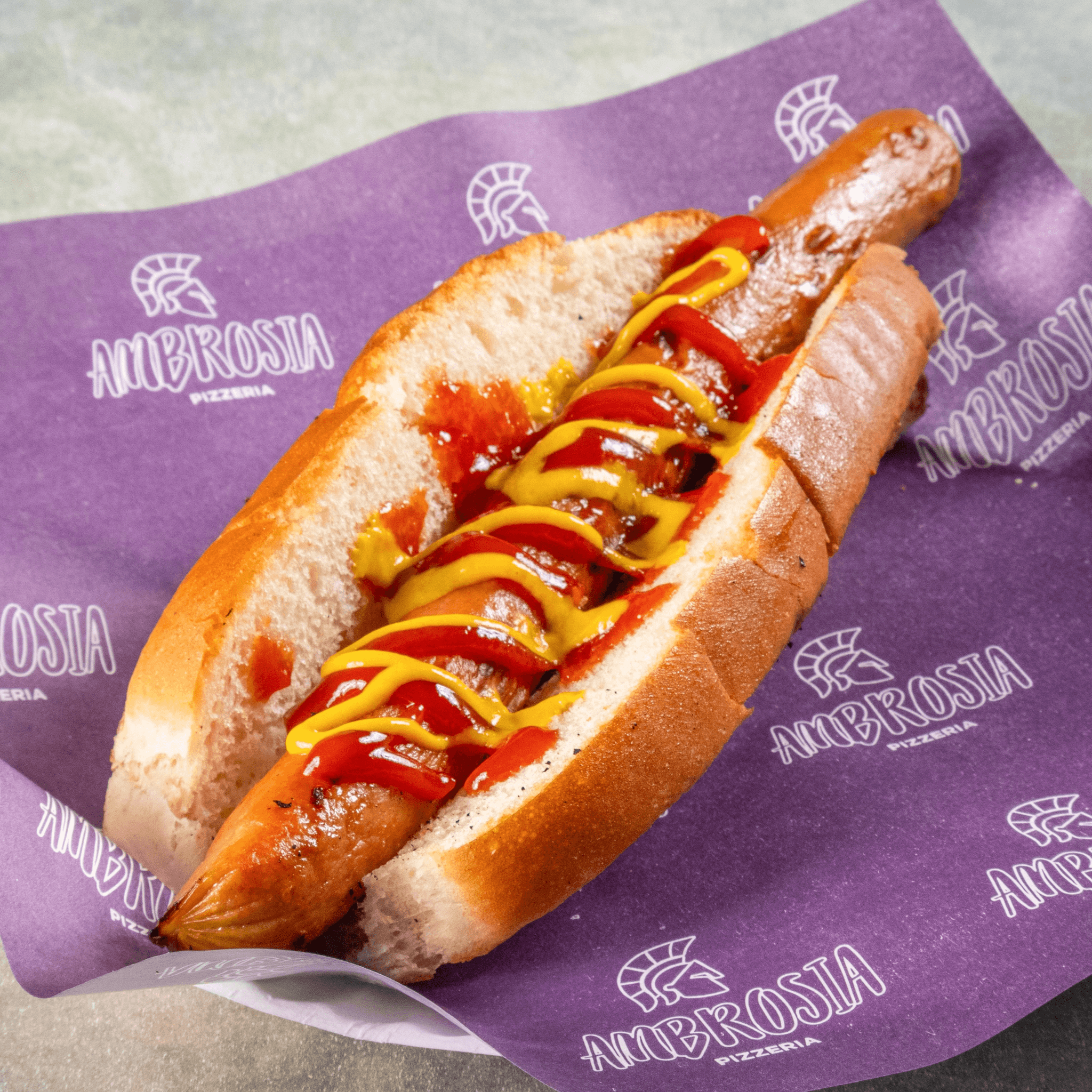 Footlong hot dog on grilled buttered roll