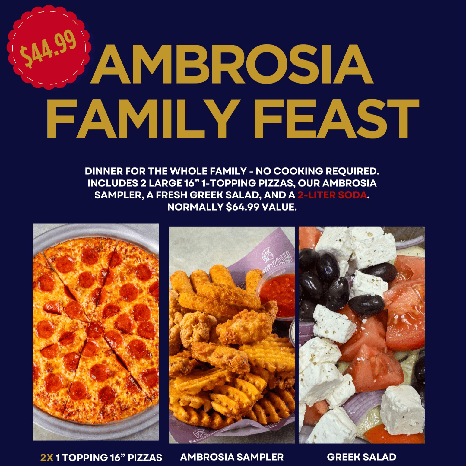 Dinner for the whole family - no cooking required. Includes 2 Large 1-Topping Pizzas, our Ambrosia Sampler, a fresh Greek Salad, and a 2-Liter Soda. A $64.99 value.