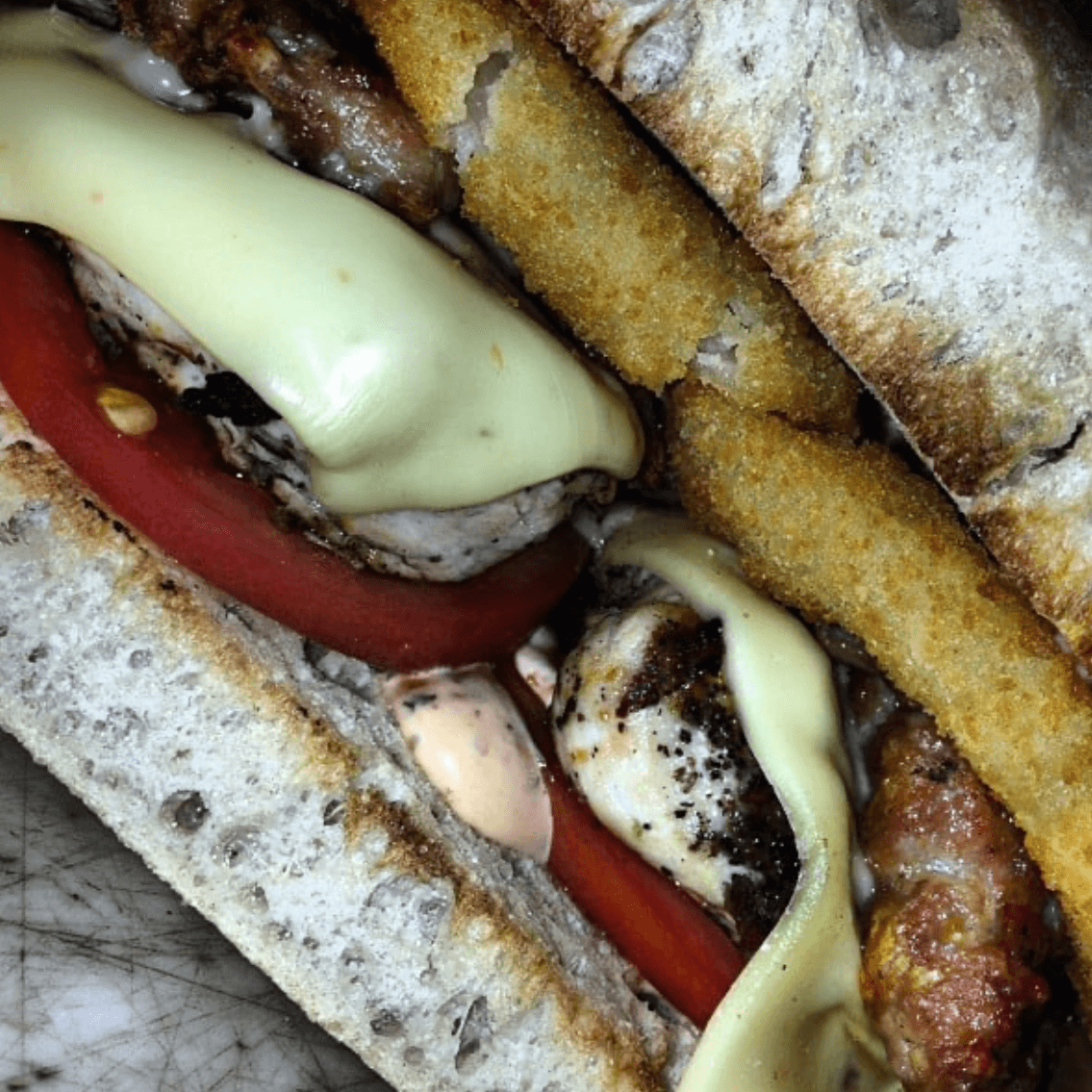 Grilled chicken, sausage, onion rings, and chipotle dressing on ciabatta bread